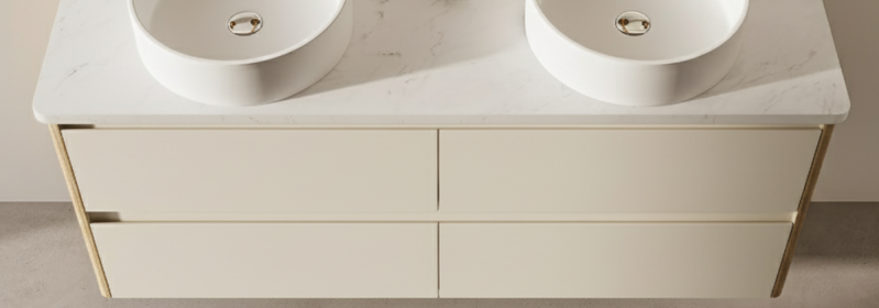 A Duotone finish combines two complementary finishes on a single piece of furniture. At Bath Co., you can pair Custom Colour drawer fronts with Timber Veneer base units, or vice versa, creating a look that’s entirely your own. The result is a modern, layered aesthetic that elevates your vanities or laundry units beyond the ordinary.