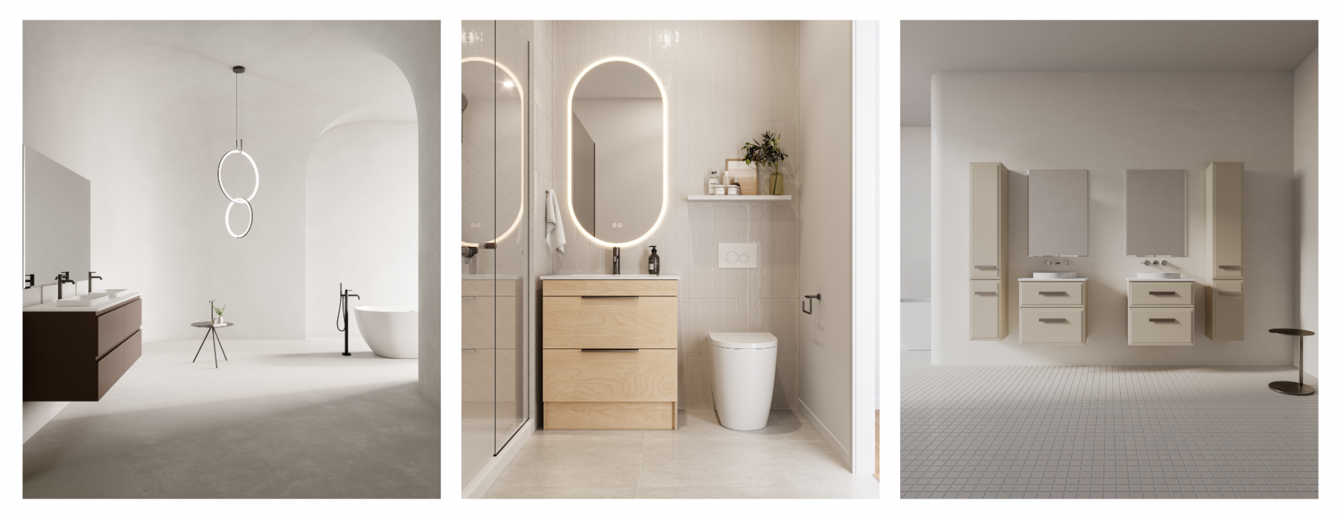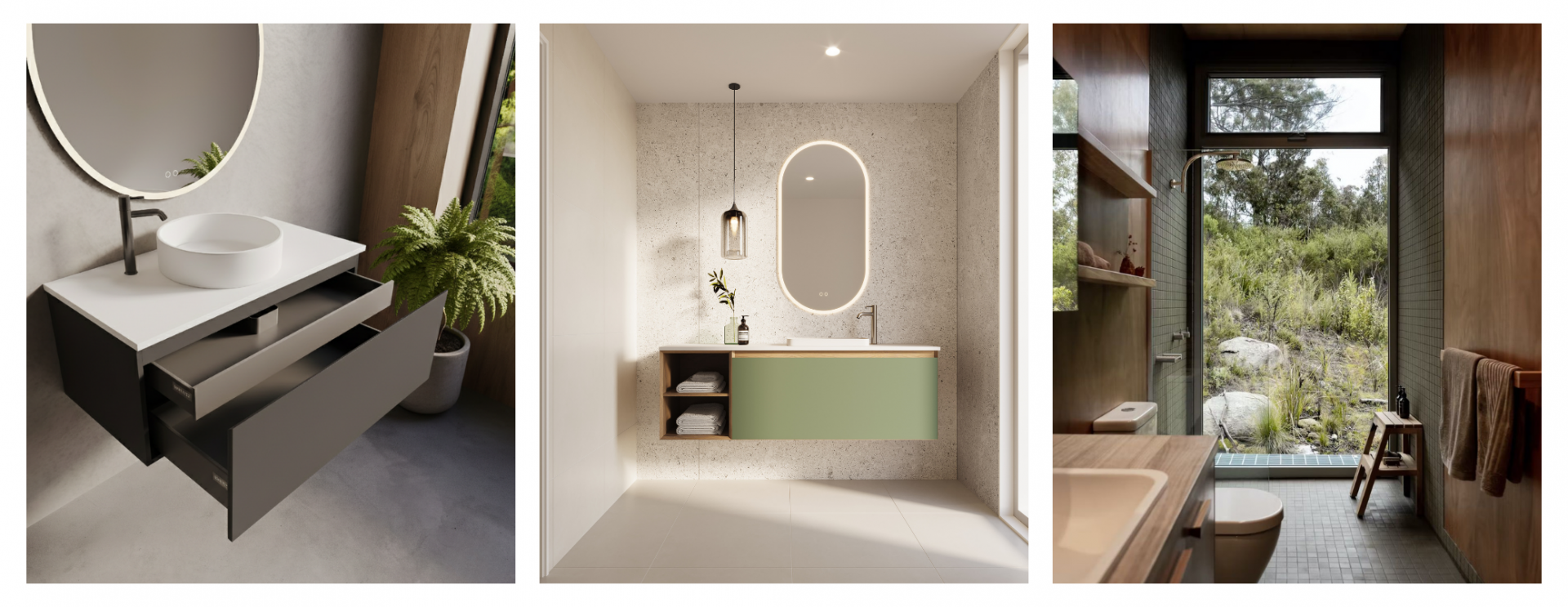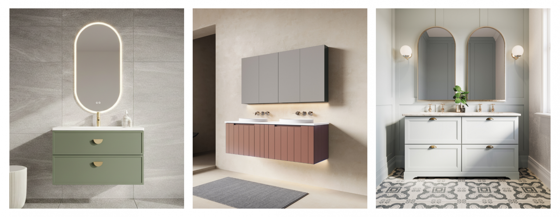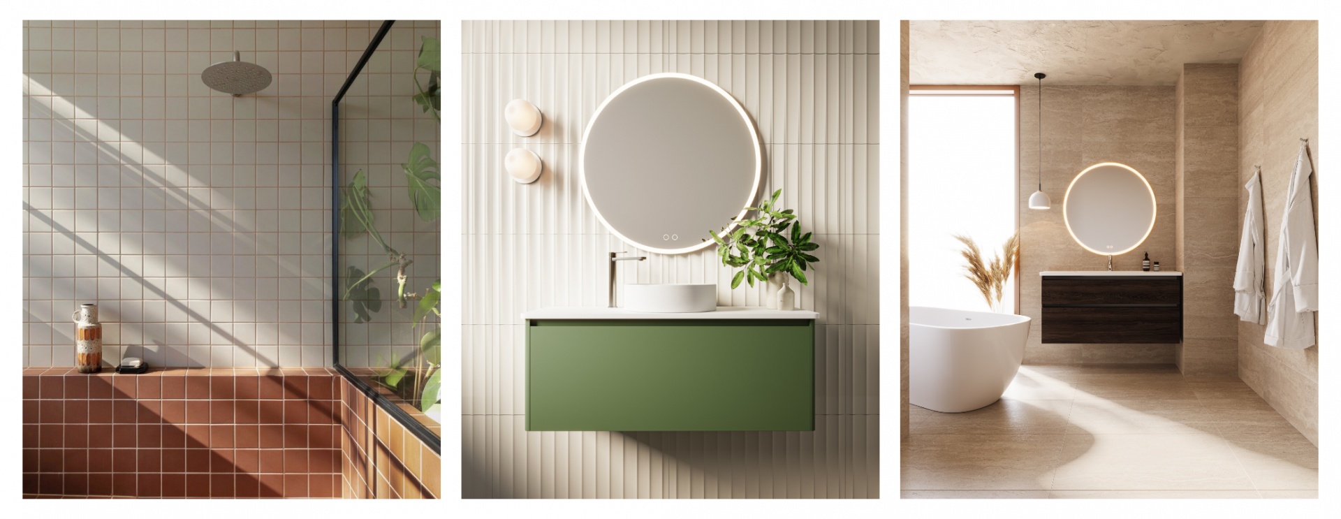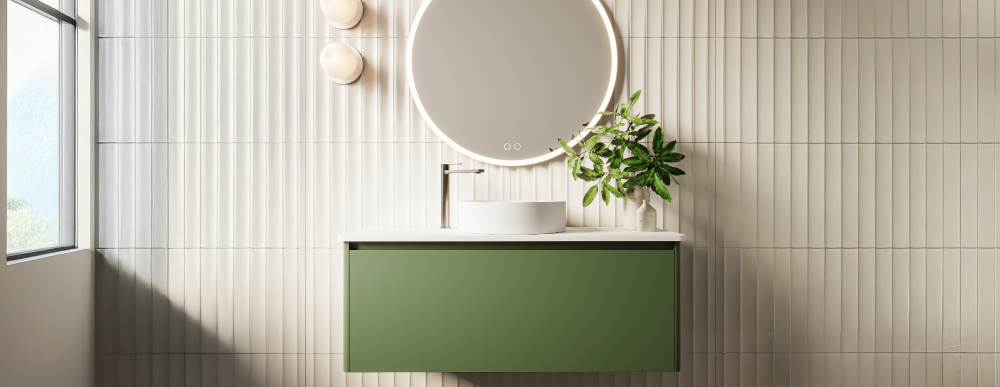 Tip: Use Bath Co’s custom colour vanities to balance warm tones with timber or stone accents for a refined, organic finish.