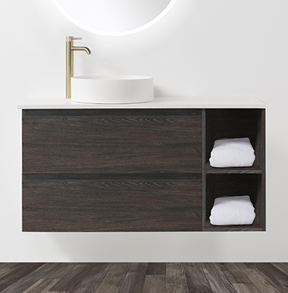 The Soft Solid Surface + Open Shelf Module is the perfect vanity for creating a designer look in your bathroom with added storage and an abundance of personalisation.