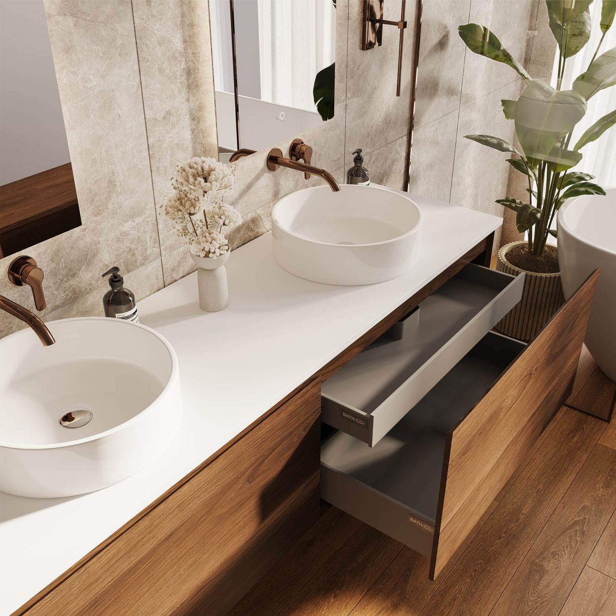 Zero embodies refined simplicity with 45° mitred corners, a handle-free design, and concealed drawers for a sleek profile. Available in natural Timber Veneer, signature white hard paint, or a Custom Colour, with a white Kordura top and your choice of basins, with the option to upgrade to coloured top for added warmth. Zero is both elegant and practical.
